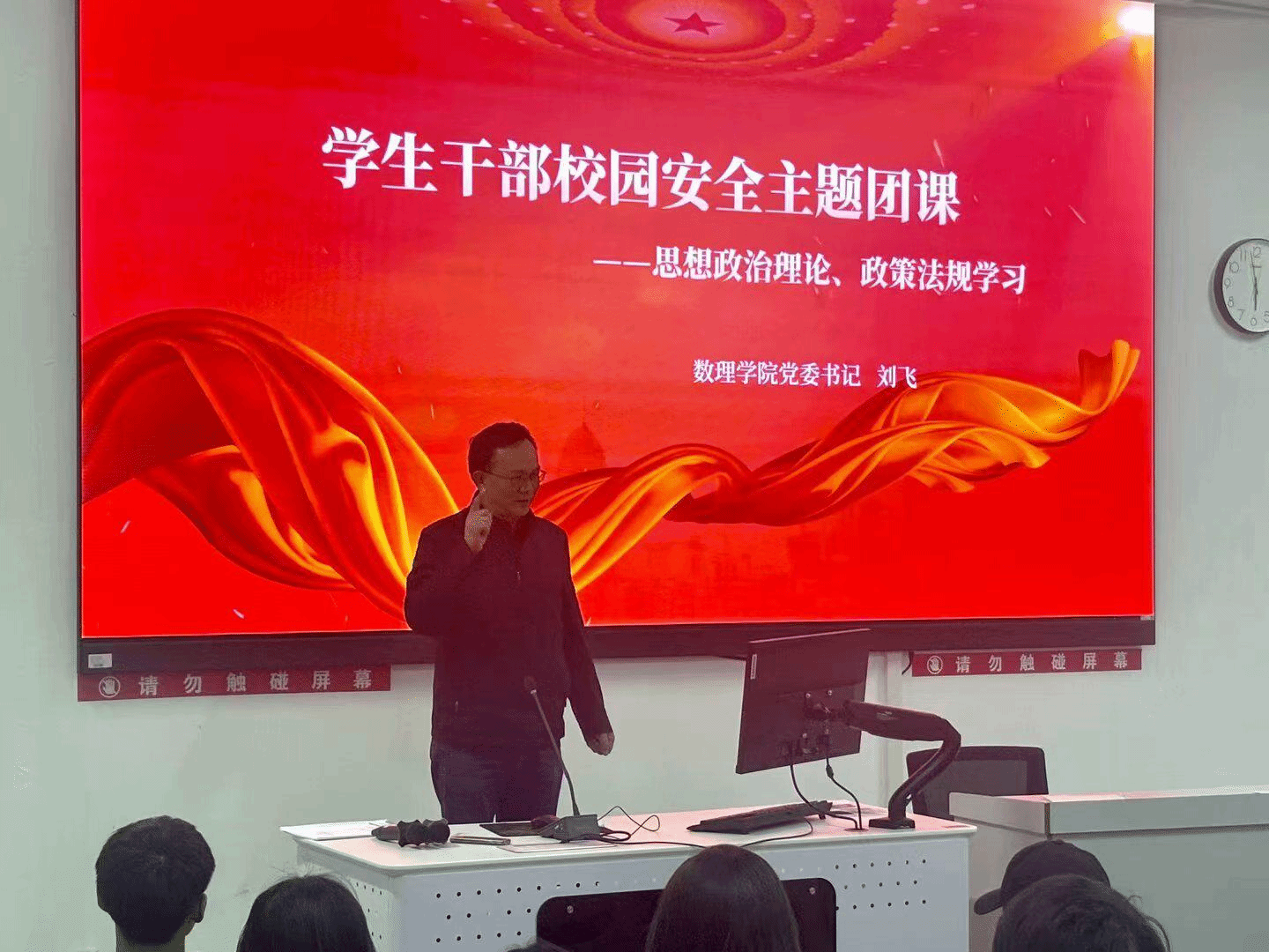 2025年3月6日在14教102教室,数理学院开展了学生干部校园安全主题团课,党委书记刘飞老师主讲,团委书记谢春丽老师和数理学院学生干部参加。