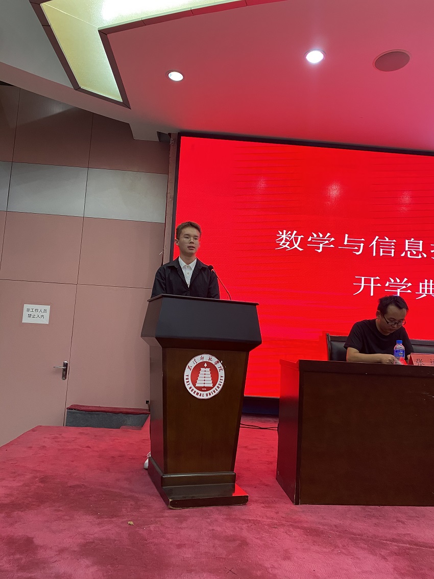 新生代表栾杰同学发言,他表示,作为新生,应该珍惜时间,珍惜资源,努力积累知识,增长才干,热爱学校,以高度的责任感、满腔的热情、昂扬的精神投入到校园实践活动中,用执着的初心、蓬勃的热情迎接全新的挑战。