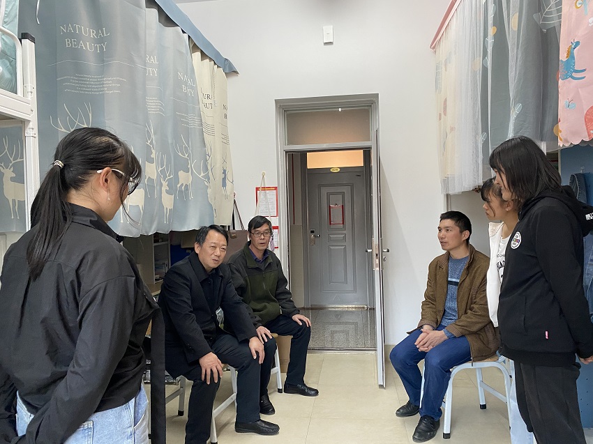 李长虹书记一行依次走访两位同学所在宿舍,询问同学们的学习与生活情况。李书记从询问同学们一天的生活开支,了解她们的生活,关心两位同学在学习期间的生活的保障;同时,李书记十分关切同学们的学习,详细询问了她们的学习情况,并根据自己的求学经历为两位同学提供学习建议并告诫她们珍惜大学时光,充分利用学习资源提升自己的学习,为未来做好知识的储备;最后,李书记还详细询问两位同学和同宿舍舍友的相处情况,并且提出同学们与宿舍成员之间要互相尊重,互相沟通,做到互帮互助,共同完成学业,营造深厚的友谊关系,促进自己的成长成才。