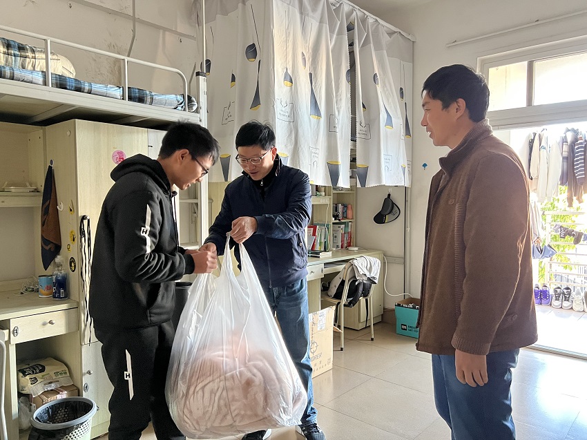 12月14日下午,学校副校长章新、数学与信息技术学院党委书记张敏,学院辅导员詹婷共同前往学生宿舍F栋,看望2021级新生,为他们送去冬季保暖慰问品,表达学校及学院对他们的关心关怀。