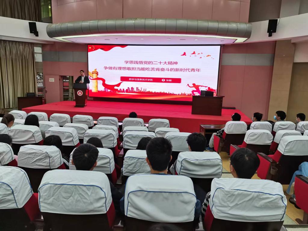 2023年3月28日晚上,数学与信息技术学院党委书记张敏在图书馆多元学术厅为全体学生党员、发展对象和入党积极分子以及党支部书记讲授“学习党的二十大精神”专题党课。