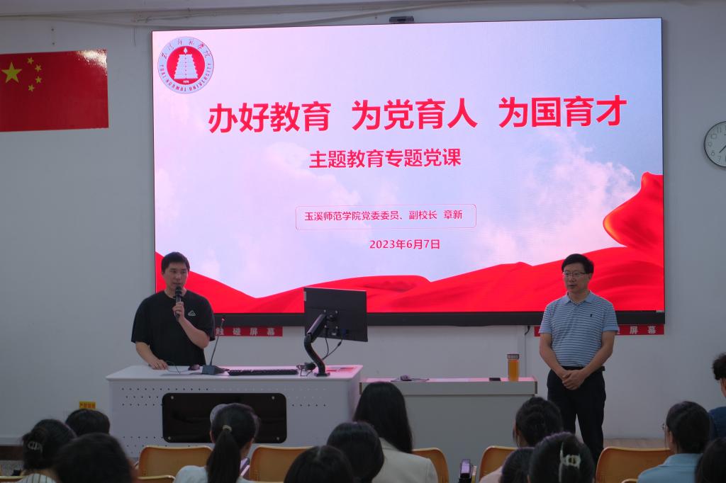2023年6月7日下午,章新副校长在14教103室为数学与信息技术学院和化学生物与环境学院的全体学生党员共计160余人讲授主题教育专题党课。