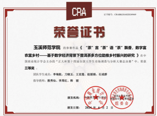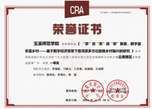 在此次比赛中,我校5支队伍进入省赛,4支队伍荣获省级一等奖、1支队伍获省级二等奖。其中,我校茶“数”联盟队的报告《“茶”言“茶”语“茶”飘香,数字富农富乡村——基于数字经济背景下普洱茶多方位助推乡村振兴的研究》作为地州院校唯一一支进入省赛决赛答辩的队伍,于2024年4月27日到云南大学参加答辩,角逐国赛总决赛名额。在激烈的竞争中玉溪师范学院代表队脱颖而出,凭借出色的表现荣获佳绩,取得了全国总决赛三等奖的荣誉。