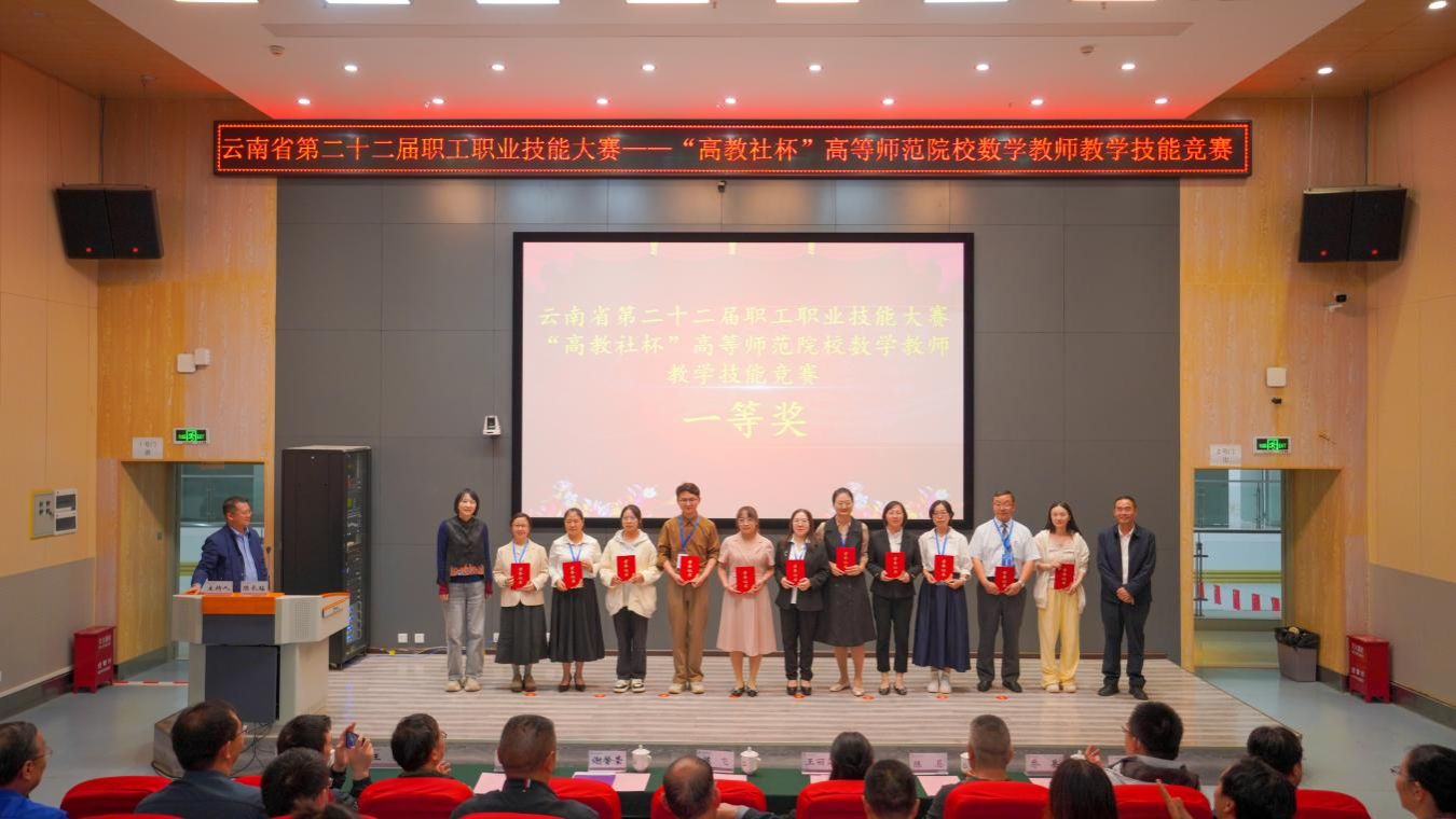 近日,云南省第二十二届职工职业技能大赛——“高教社杯”高等师范院校数学教师教学技能竞赛在云南师范大学呈贡校区圆满落幕。经过10月16日至17日两天的激烈角逐,我校数理学院梁金华、陈亦佳和殷秀仙三位教师从众多选手中脱颖而出进入决赛,最终均获一等奖,10项一等奖我校和云南师范大学各获3项!上一届比赛学院获二等奖2项,此次获奖刷新了数理学院在该赛事上的历史成绩,这一成绩充分展现了我校数学教师扎实的专业功底、精湛的教学技艺。